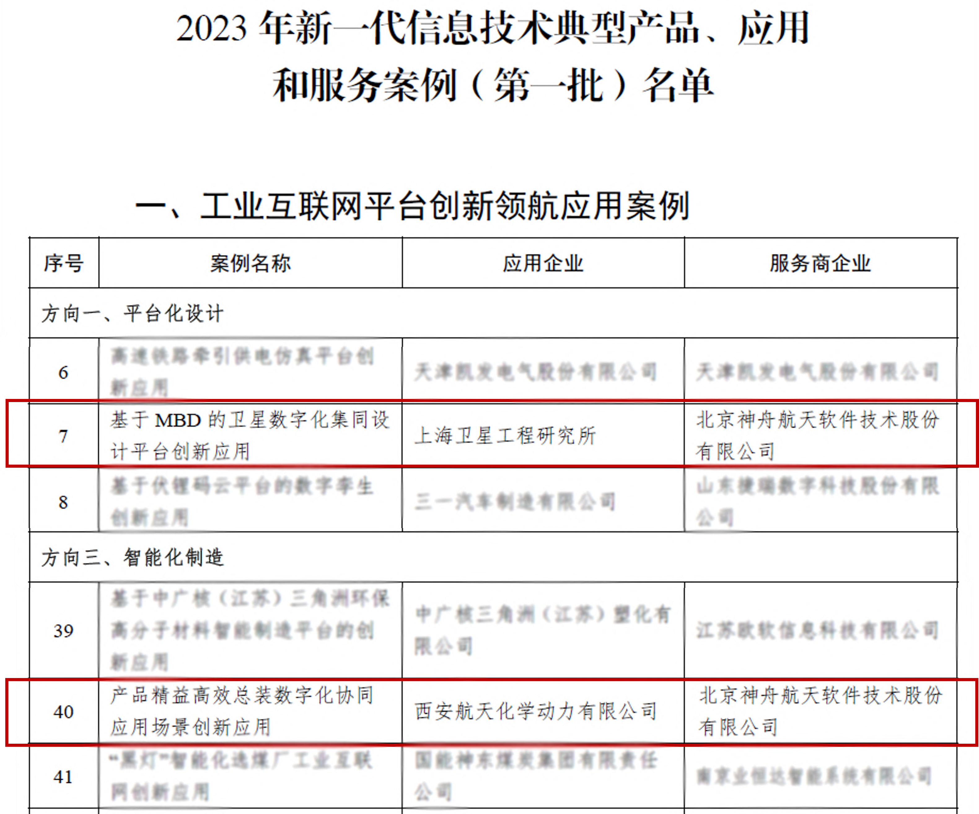 工業(yè)和信息化部為了讓更多地方和企業(yè)應(yīng)用新一代信息技術(shù),推動高質(zhì)量發(fā)展提供路徑參考,促進(jìn)制造業(yè)高端化、智能化、綠色化發(fā)展,加快推動新型工業(yè)化,以新一代信息技術(shù)與制造業(yè)融合發(fā)展為主題,圍繞典型產(chǎn)品、典型應(yīng)用、典型服務(wù)模式等方向,遴選出一批優(yōu)秀典型案例,并于近期公布了2023年新一代信息技術(shù)典型產(chǎn)品、應(yīng)用和服務(wù)案例(第一批)名單,由神軟公司提供服務(wù)支撐,上海衛(wèi)星工程研究所建設(shè)的“基于MBD的衛(wèi)星數(shù)字化集同設(shè)計平臺創(chuàng)新應(yīng)用”項(xiàng)目,及西安航天化學(xué)動力有限公司建設(shè)的“產(chǎn)品精益高效總裝數(shù)字化協(xié)同應(yīng)用場景創(chuàng)新應(yīng)用”項(xiàng)目入選。
