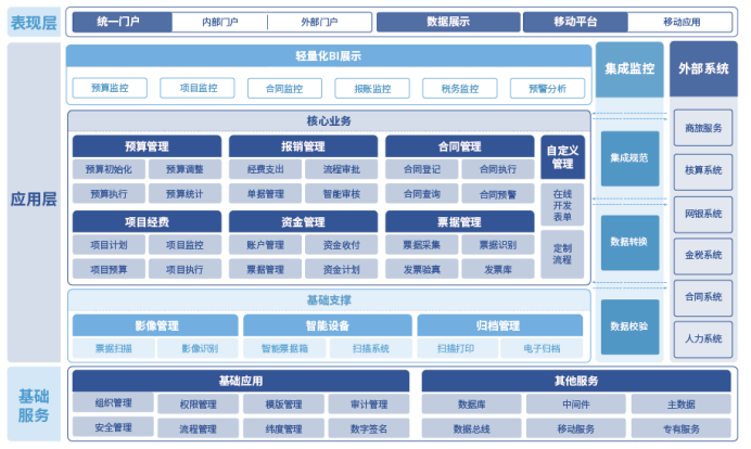 • ??財金管控系統(tǒng)是為適應集團化企業(yè)“戰(zhàn)略管控”、“財務管控”、“業(yè)務管控”的管理模式的現(xiàn)狀研發(fā)的產(chǎn)品,擁有“高可用、高擴展、高易用”的產(chǎn)品特色,將移動互聯(lián)、人工智能、大數(shù)據(jù)技術與財務信息化經(jīng)驗(系統(tǒng)功能、安全保密、模塊劃分、業(yè)務需求等)積累充分結合,為企業(yè)提供符合自身業(yè)務特點的開放型財務共享服務平臺。